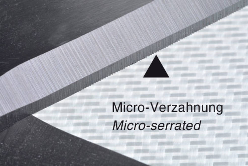 Die einseitig microverzahnte Schneide verhindert das Verrutschen technischer Textilien während des Schneidvorgangs. Dadurch sind maßgenaue Zuschnitte auch bei mehrlagigen oder leichten Geweben möglich.